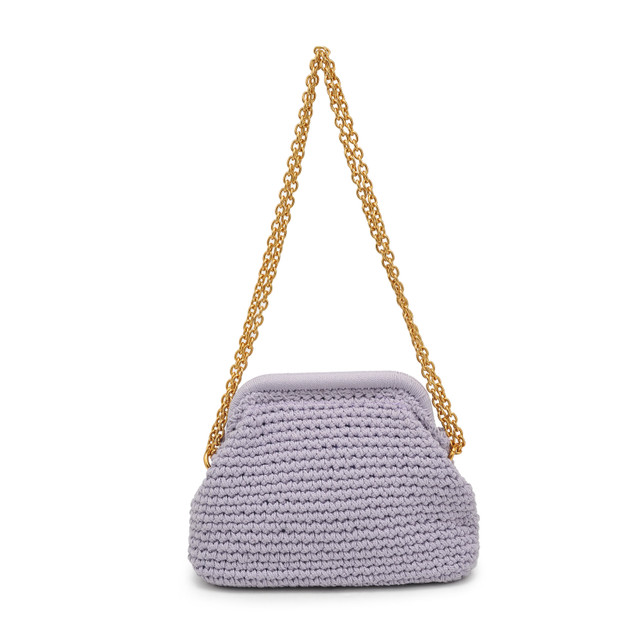 This soft woven crossbody bag features a textured knit exterior paired with a gold-tone chain strap for a stylish, elevated look. The structured frame opening reveals a smooth fabric-lined interior with slip pockets, offering a blend of charm and practical organization.
