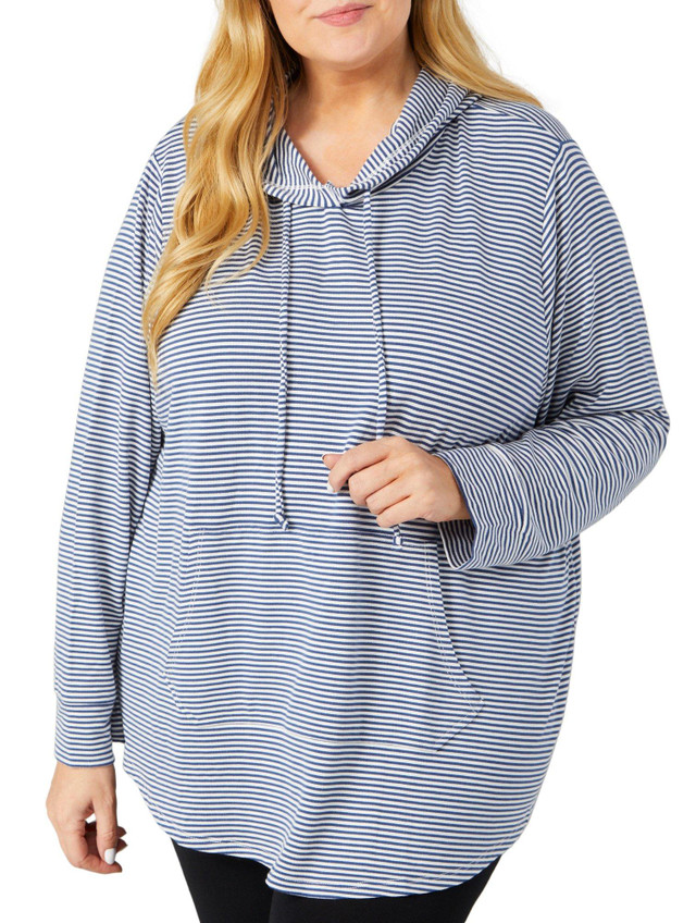 Stay cozy and stylish with our Plus Striped Hoodie. Crafted from a blend of rayon, polyester, and spandex, this hoodie offers a soft and lightweight feel. The stylish striped print and hooded neckline add a trendy touch, while the kangaroo pocket provides practicality. With long sleeves and a 28-inch length, this hoodie is perfect for any casual occasion.
