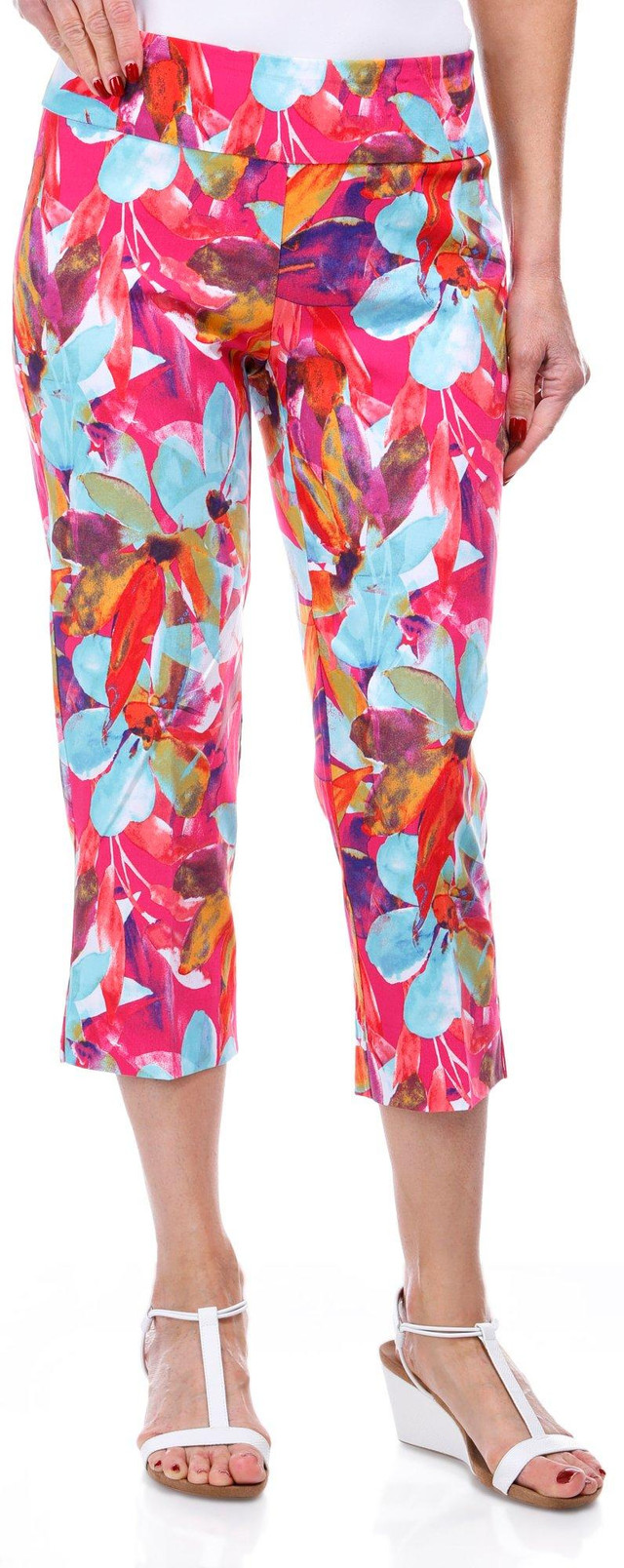 Introducing these Mill Capris, where style meets functionality. These capris feature a vibrant print pattern that adds a pop of color to your wardrobe. The standout feature is the innovative mesh tummy panel, designed to provide extra support and a flattering fit. Perfect for any activity, from yoga to running errands, the Mill Capris offer comfort and confidence in every move. Inseam measures approximately 23 in. Fabrication is 76% rayon, 21% nylon, 3% spandex.