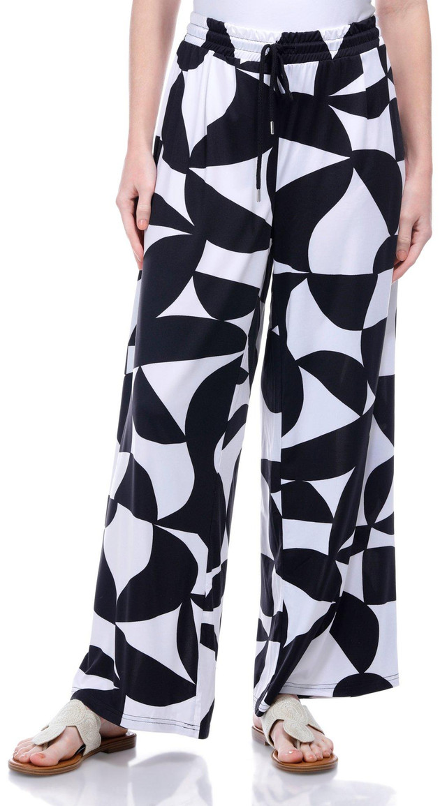 Introducing the Women's Geometric Drawstring Wide Leg Pants, designed for both comfort and style. Made from a blend of polyester and spandex, these pants feature a striking geometric print that adds a modern touch to any outfit. The drawstring waistband ensures a customizable fit, while the wide leg design offers a relaxed and flattering silhouette. With a 29-inch inseam, these pants are perfect for casual outings or relaxed weekends, making them a versatile addition to your wardrobe.