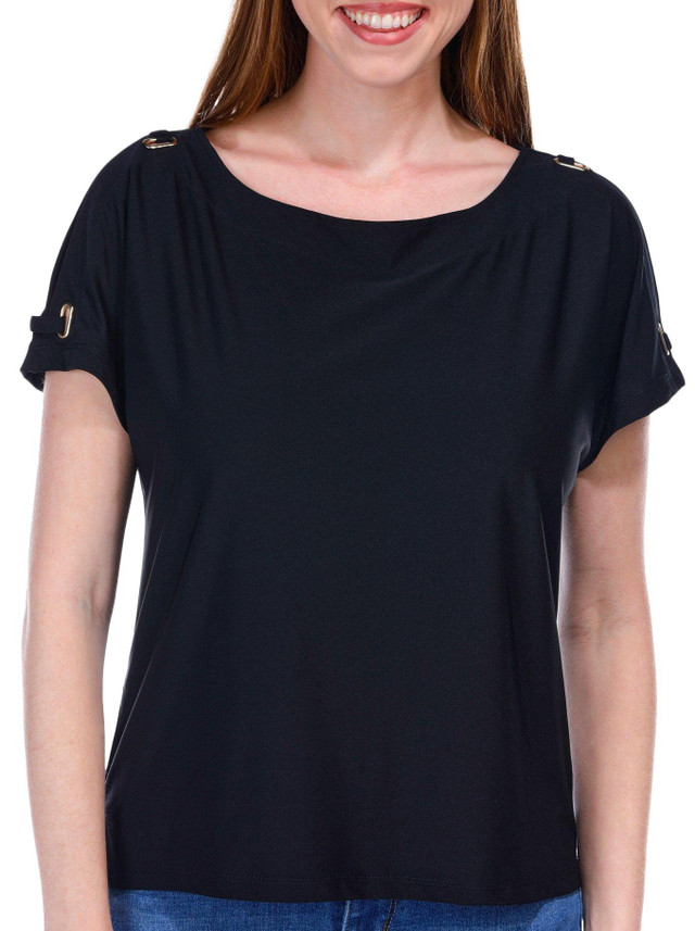 Elevate your style with this Short Sleeve Top, featuring open sleeves adorned with chic grommet details. The solid color design adds a sleek touch, making it perfect for any occasion. This versatile piece combines comfort and fashion effortlessly, ensuring you look stylish whether you're dressing up or keeping it casual. Embrace a unique blend of elegance and modern flair with this must-have addition to your wardrobe. Fabrication is 95% polyester, 5% spandex.