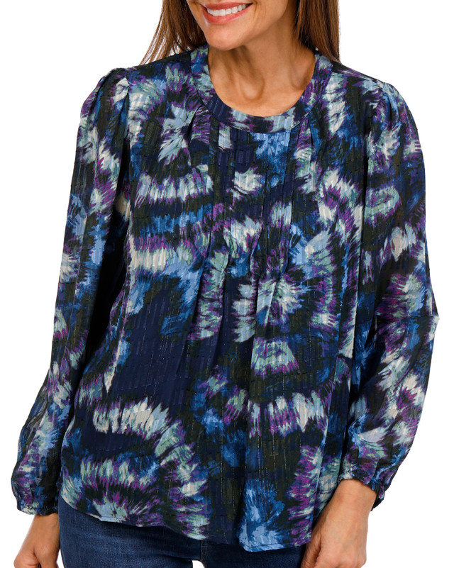Brighten your everyday look with the Womens Long Sleeve Tie Dye Top. Made from a lightweight blend of 99% polyester and 1% lurex, this top offers a soft feel with a subtle shimmer woven throughout. Measuring approximately 24 inches in length, it provides comfortable, flattering coverage.
