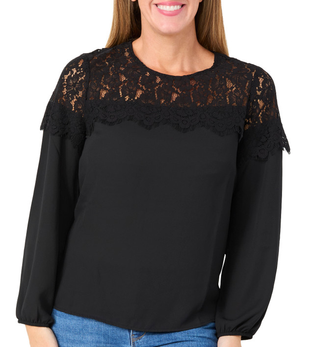 Add elegant texture to any outfit with the Womens Long Sleeve Woven Lace Top. Featuring intricate woven lace and a flattering long sleeve design, this stylish piece offers lightweight comfort and refined appeal. Perfect for dressy occasions or elevated everyday wear. Fabrication is 80% nylon, 20% spandex (lace); 100% polyester (shell).