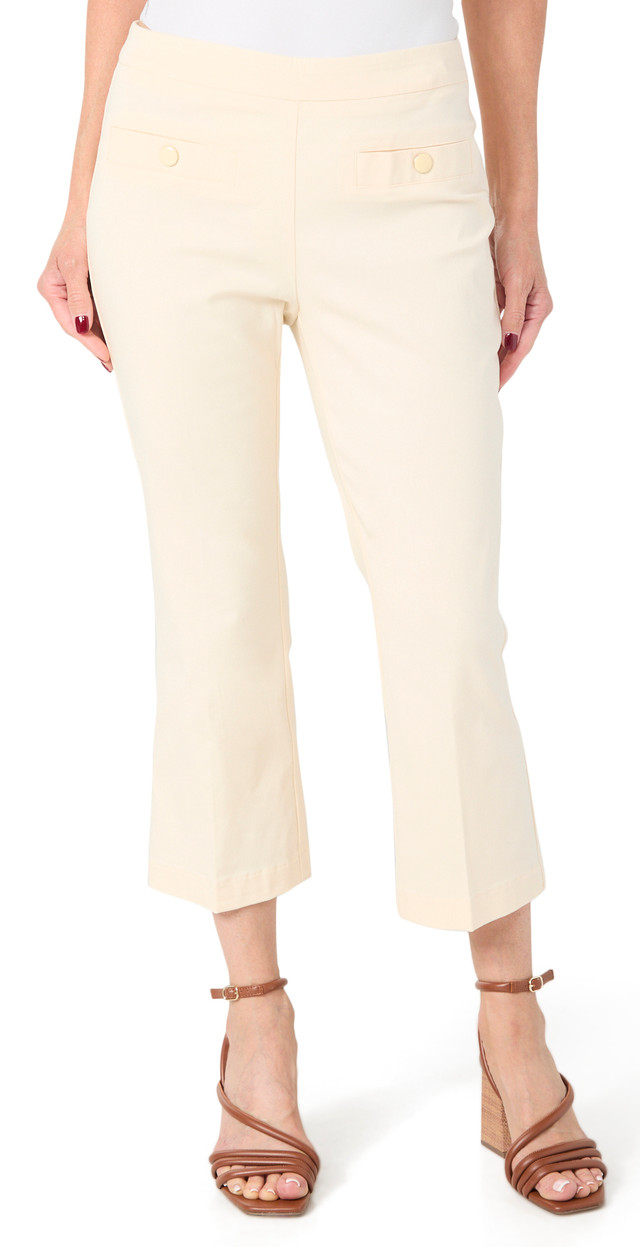 Step out in style with these womens pull-on kick flare capris! Featuring a sleek solid color, faux pockets with chic button accents, and a 23 inch inseam for a flattering fit. Perfect for casual days or polished looks. Fabrication is 76% rayon, 21% nylon, 3% spandex.