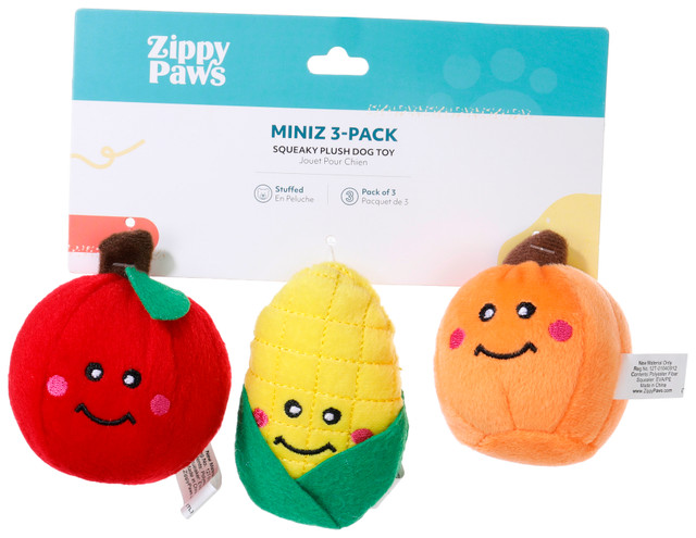 Celebrate the harvest season with the 3 Piece Harvest Dog Toy Set featuring a plush corn, orange pumpkin, and red gourd, each equipped with a builtin squeaker for added playtime fun. Perfect for festive fall enrichment. Fabrication is 100% polyester.