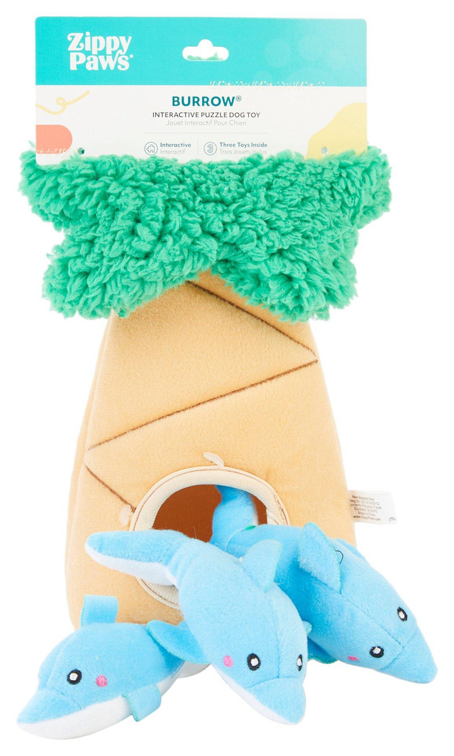 Stimulate your pets mind with the Dolphins & Palm Tree Interactive Puzzle Dog Toy featuring three plush dolphins each with a built in squeaker tucked inside a soft palm tree. Designed to encourage problem solving and active play. Great for dogs that like to burrow. Fabrication is 100% polyester. Measures approximately 10 in x 4 in diameter (palm tree) 5 in x 3 in x 3 in (dolphins).